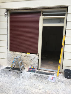 Neuanfertigung Ladeneingangstür mit Schaufenster und Holzrollladen laut Bestand